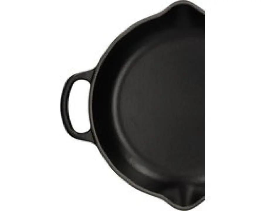 Deze pan is voorzien van twee schenktuiten, waardoor overtollig vet en vocht makkelijk afgegoten kunnen worden zonder geknoei. De pan heeft een vlakke bodem en is geschikt voor gebruik op een brander. De gietijzeren handgreep geleidt de warmte, wat zorgt voor een stevige grip tijdens het koken.