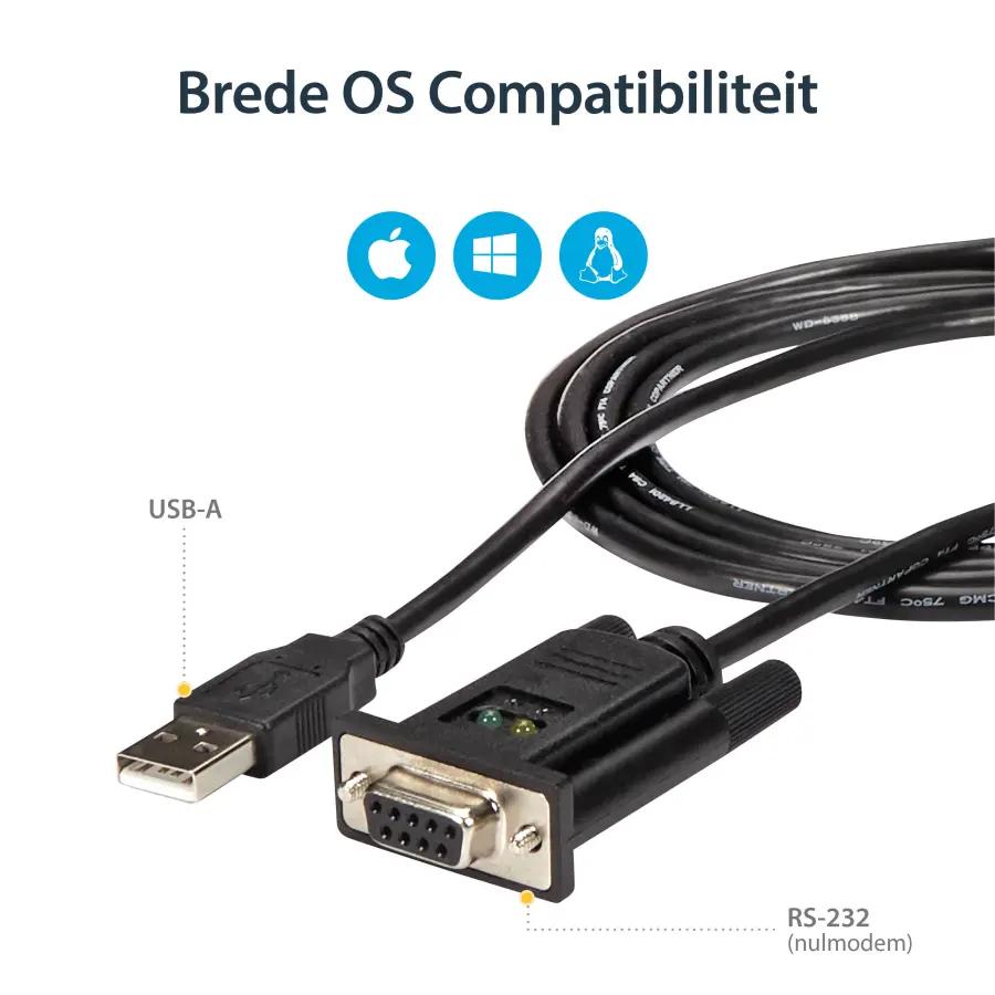 Deze adapterkabel ondersteunt diverse besturingssystemen, waaronder Windows 10 in verschillende versies, Linux en meerdere versies van Mac OS X. Zo ben je verzekerd van brede compatibiliteit, ongeacht welk systeem je gebruikt. De kabel is voorzien van een mannelijke USB Type-A connector en een vrouwelijke DB-9 connector, beide met een rechte vormfactor voor eenvoudige en directe aansluiting.
