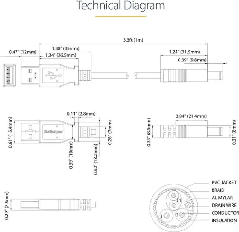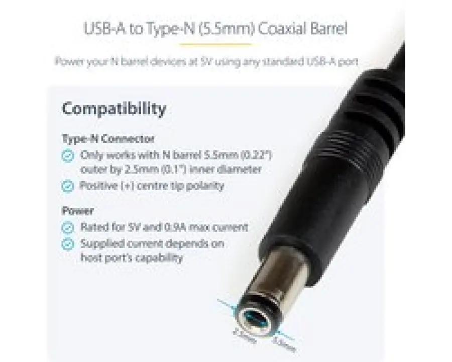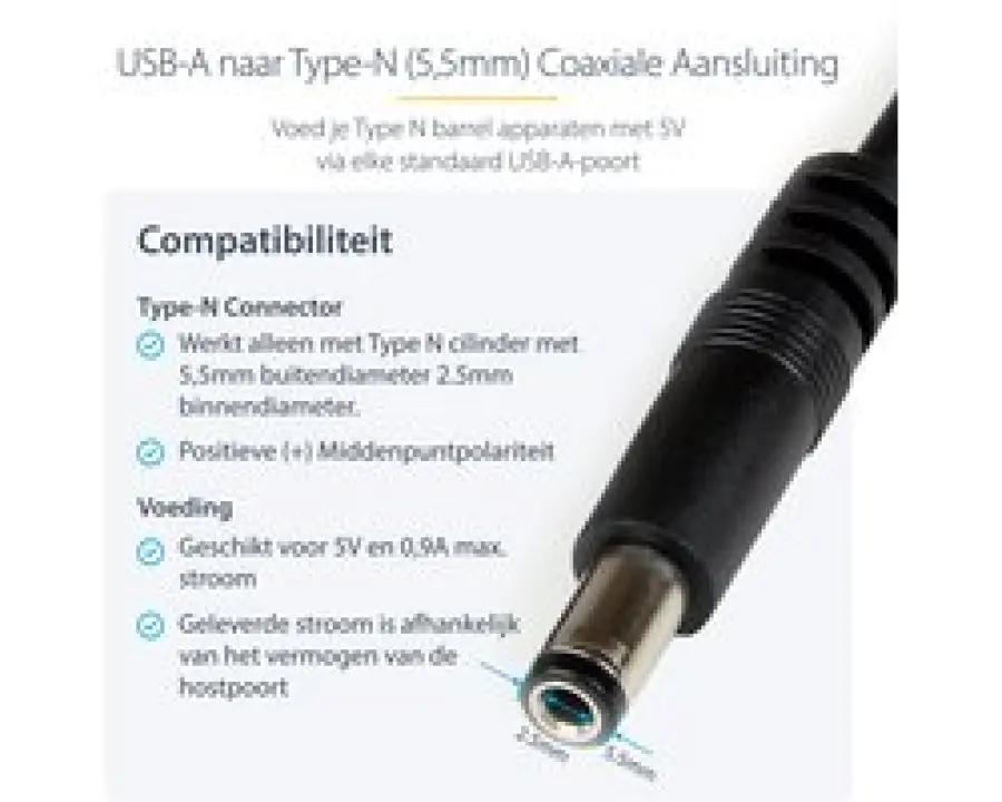 De kabel is uitgerust met een USB 2.0 A Male aansluiting aan de ene kant, wat zorgt voor een brede compatibiliteit met verschillende USB-poorten. Aan de andere kant vind je een 5,5 x 2,5 mm DC Plug Type N aansluiting, speciaal ontworpen om een betrouwbare en veilige verbinding te garanderen met jouw voedingsapparaten. Zo hoef je je geen zorgen te maken over slechte verbindingen of stroomuitval tijdens gebruik.