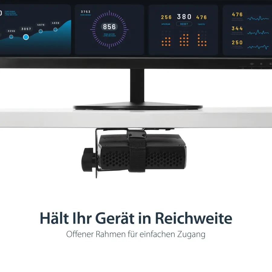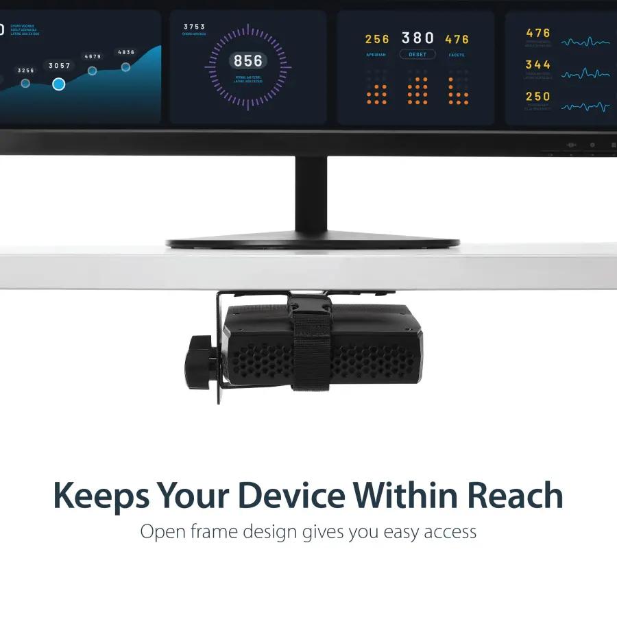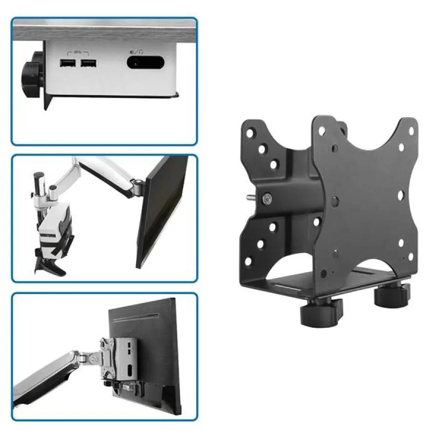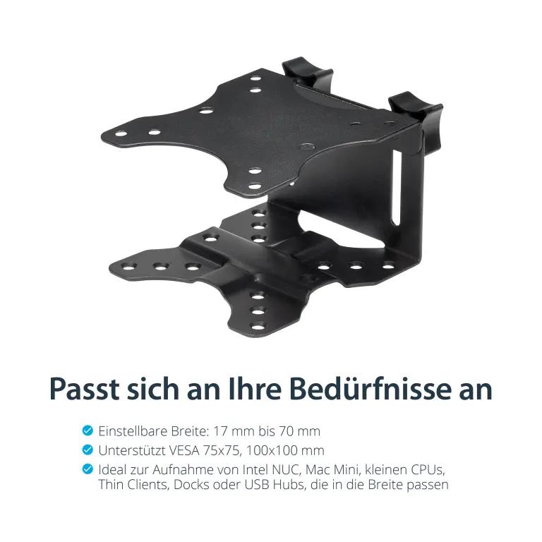 De houder heeft een dubbelzijdige VESA-montagesteun die compatibel is met 75x75 en 100x100 mm standaard. Dit betekent dat je hem moeiteloos aan de achterkant van je monitor, onder je bureau of zelfs aan een monitorarm kunt bevestigen. De verstelbare breedte van 17 tot 70 mm maakt het mogelijk om verschillende apparaten stevig vast te zetten, van Intel NUC tot Mac Mini en de meeste kleine CPU’s en docking stations.