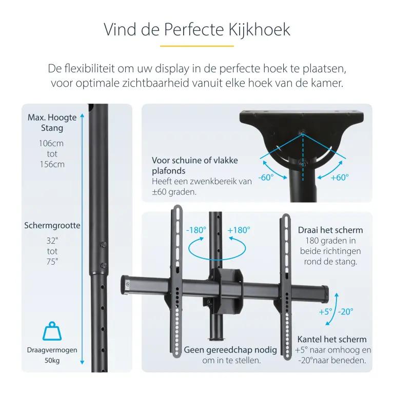 Met de StarTech FPCEILBTB dual TV plafondbeugel heb je twee schermen perfect in zicht. Deze stevige beugel is geschikt voor schermen van 32" tot 75" en kan tot 45 kg per scherm dragen. Dankzij de telescopische paal is de hoogte eenvoudig verstelbaar tussen 1060 en 1560 mm, waardoor je jouw schermen altijd op de ideale kijkhoogte plaatst.