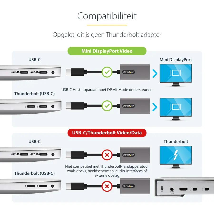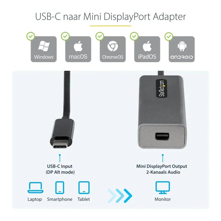 Deze adapter is geschikt voor USB Type-C poorten en werkt uitstekend met Thunderbolt 3. Met een mannelijke USB-C connector en een Mini DisplayPort uitgang sluit je eenvoudig je USB-C apparaat aan op een Mini DP monitor of ander display. De vaste kabel van 30 cm zorgt voor een nette en stabiele verbinding zonder gedoe met extra kabels.