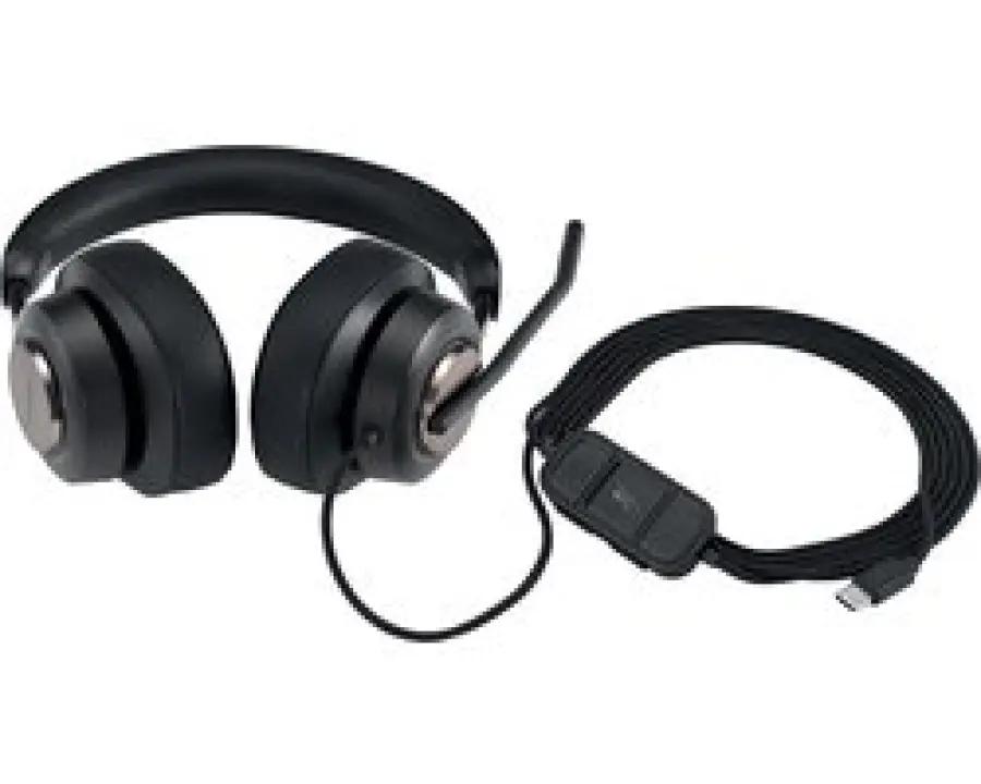 De headset heeft een 1,8 meter lange USB-C-kabel van gevlochten nylon die niet snel in de knoop raakt. De kabel wordt geleverd met een USB-C-naar-USB-A-dongle, zodat je hem makkelijk aansluit op verschillende apparaten. Deze bedrade verbinding zorgt voor een stabiele verbinding en geeft je de vrijheid om af en toe even op te staan tijdens lange gesprekken. Bovendien wordt de headset geleverd met een handige flanellen reistas om hem veilig mee te nemen.