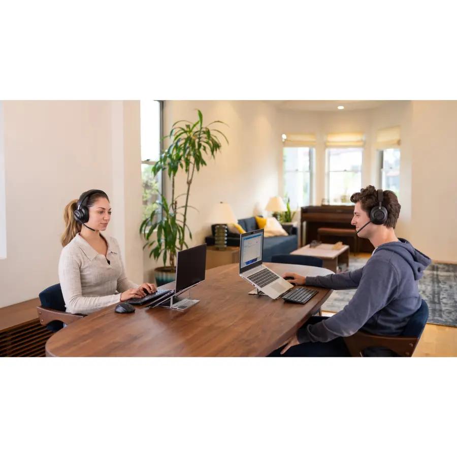 Deze headset gebruikt multi-point Bluetooth 5.2, waarmee je tot 8 apparaten kunt koppelen en met twee tegelijk actief kunt zijn. Zo wissel je soepel tussen werk en privé. De batterij gaat meer dan 60 uur mee voor muziek en 40 uur voor gesprekken, met Rapid Charge-technologie die na 15 minuten opladen al 8 uur gebruik biedt. Je kunt zelfs blijven werken terwijl de headset oplaadt. Met een bereik tot 30 meter blijf je vrij bewegen zonder de verbinding te verliezen.