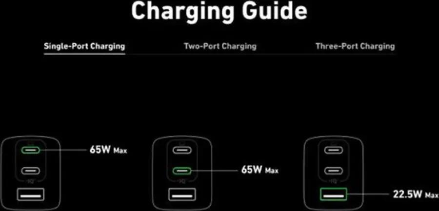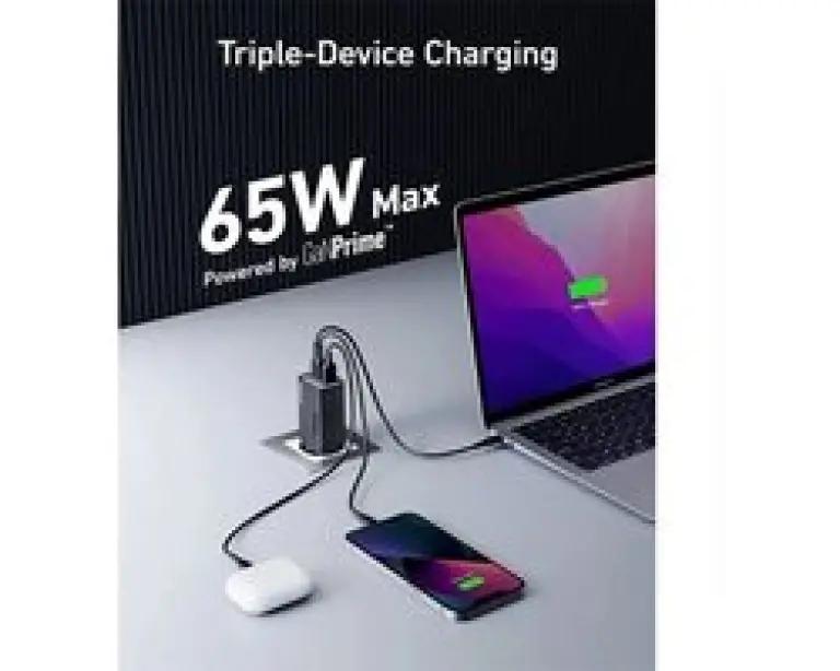 Met de Anker A2668311 laad je tot drie apparaten tegelijk op dankzij de twee USB-C-poorten en รฉรฉn USB-A-poort. Of je nu je telefoon, laptop of draadloze oordopjes wilt opladen, deze oplader regelt het moeiteloos. Wanneer je slechts รฉรฉn apparaat aansluit, kan deze zelfs tot 65 watt aan vermogen leveren voor extra snel opladen.