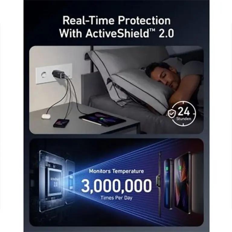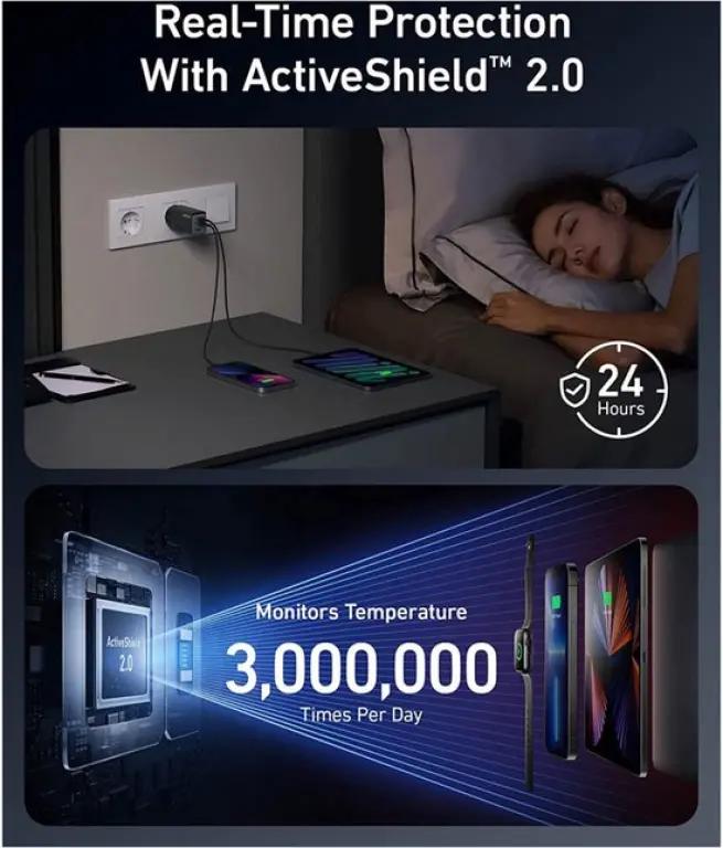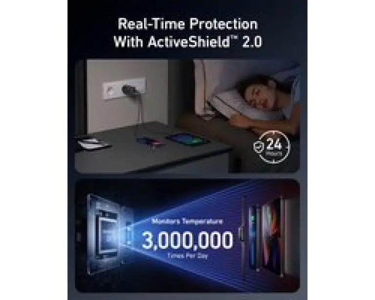 Met de zelfontwikkelde ActiveShield 2.0 technologie van Anker wordt de temperatuur van je oplader meer dan drie miljoen keer per dag gecontroleerd. Zo wordt de stroomtoevoer constant aangepast om je apparaten te beschermen tegen oververhitting en overspanning. Veiligheid en prestaties gaan dus hand in hand.