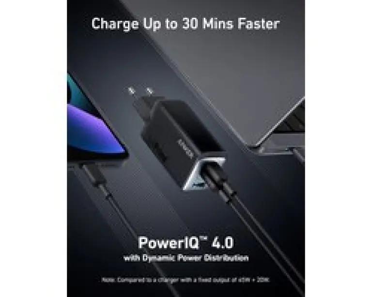 Dankzij Ankers exclusieve PowerIQ 4.0-technologie met Dynamic Power Distribution detecteert de oplader automatisch hoeveel stroom elk aangesloten apparaat nodig heeft. Hierdoor wordt de voeding optimaal aangepast en laden je apparaten tot 30 minuten sneller op dan met een standaard oplader. Zo bespaar je tijd en ben je sneller weer klaar om te gaan.