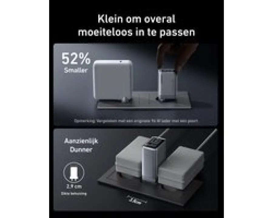 De oplader is supercompact door de opvouwbare pennen en het slimme ontwerp. Hierdoor past hij moeiteloos in je tas of zak zonder veel ruimte in te nemen. Perfect voor onderweg, zodat je altijd snel en gemakkelijk je apparaten kunt opladen waar je ook bent.