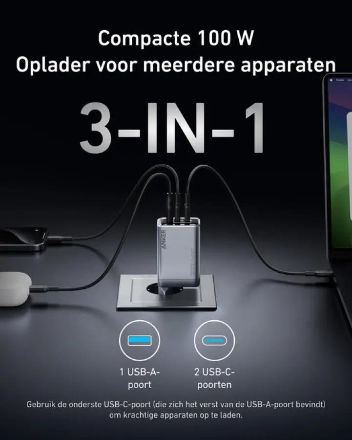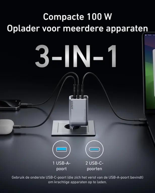 Met de Anker Prime Charger laad je tot drie apparaten tegelijk op met een totaal vermogen van 100W. Dankzij de twee USB-C poorten en één USB-A poort wordt de stroom efficiënt verdeeld, zodat al je apparaten snel en veilig worden opgeladen.