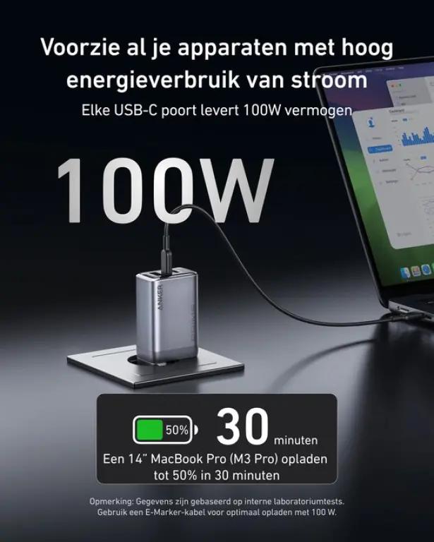 Elke USB-C poort levert maximaal 100W vermogen. Dit betekent dat je bijvoorbeeld je 14-inch MacBook Pro (M3 Pro) van 0 tot 50% oplaadt in slechts 30 minuten. Ideaal voor als je snel weer verder wilt met je werk of ontspanning.