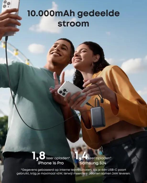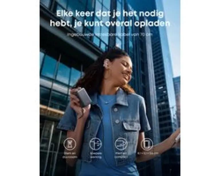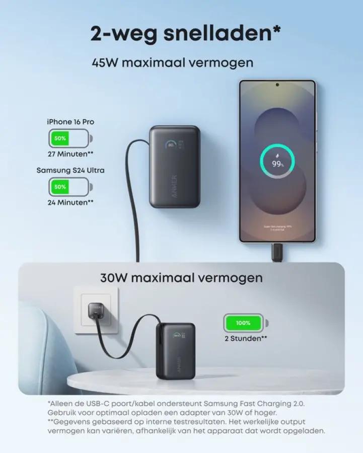De Anker Nano ondersteunt snelladen in twee richtingen: je kunt je apparaten opladen met een maximaal vermogen van 45W via de USB-C output, terwijl de powerbank zelf weer snel oplaadt met een 30W input. Zo ben je in een mum van tijd weer klaar voor gebruik, zonder lange wachttijden. De ingebouwde kabel is duurzaam en bestand tegen meer dan 20.000 buigingen, wat betekent dat je jarenlang probleemloos kunt opladen.