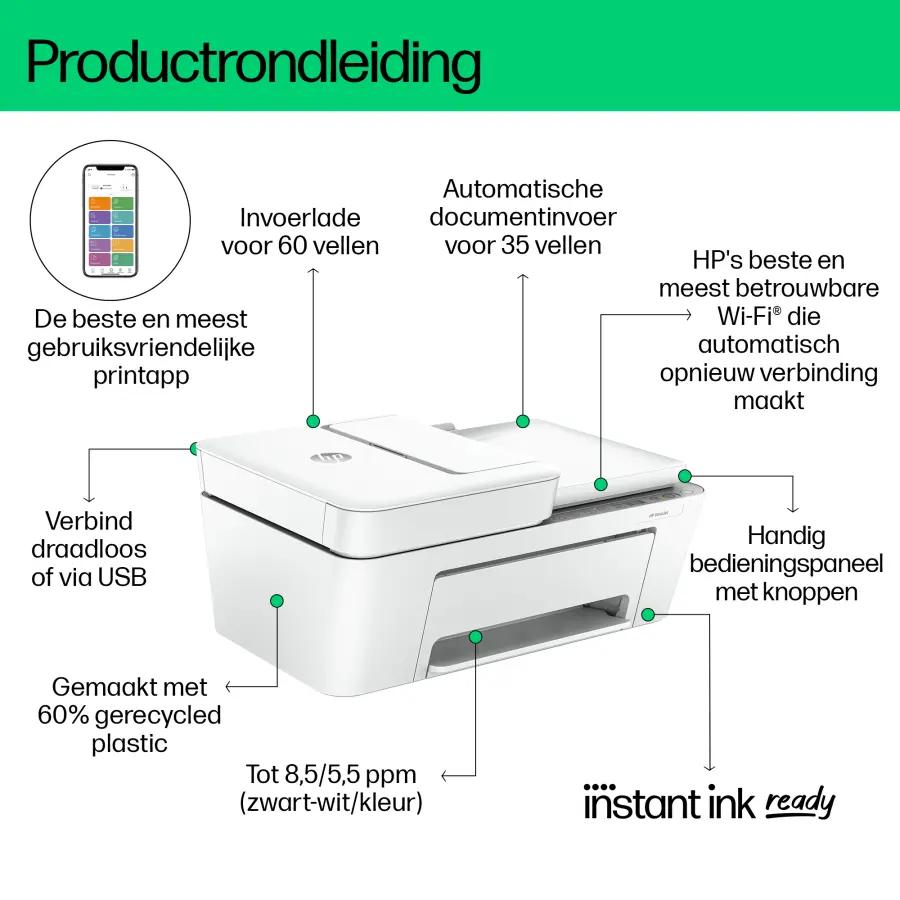 De HP DeskJet 4220e is een veelzijdige all-in-one printer die printen, kopiรซren en scannen combineert in รฉรฉn compact apparaat. Perfect voor thuis of kleine kantoren met tot 3 gebruikers. Dankzij de ondersteuning voor HP Instant Ink hoef je je nooit meer zorgen te maken over lege cartridges, want je ontvangt automatisch nieuwe inkt thuisbezorgd. Dit model ondersteunt ook HP+, wat zorgt voor een slimme, veilige en altijd up-to-date printerervaring.