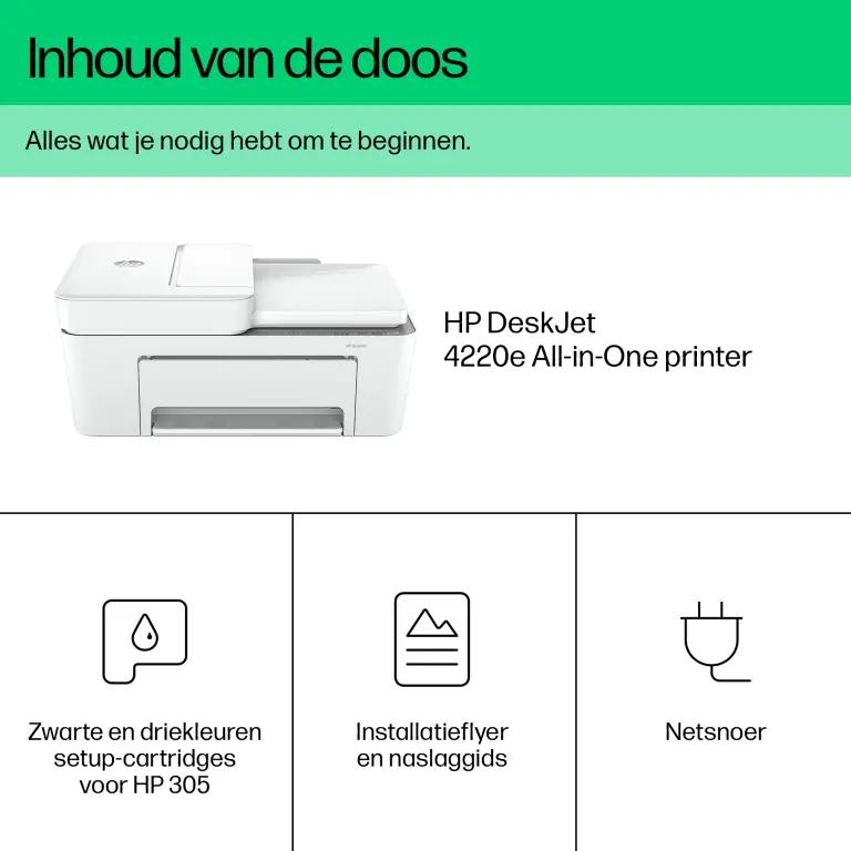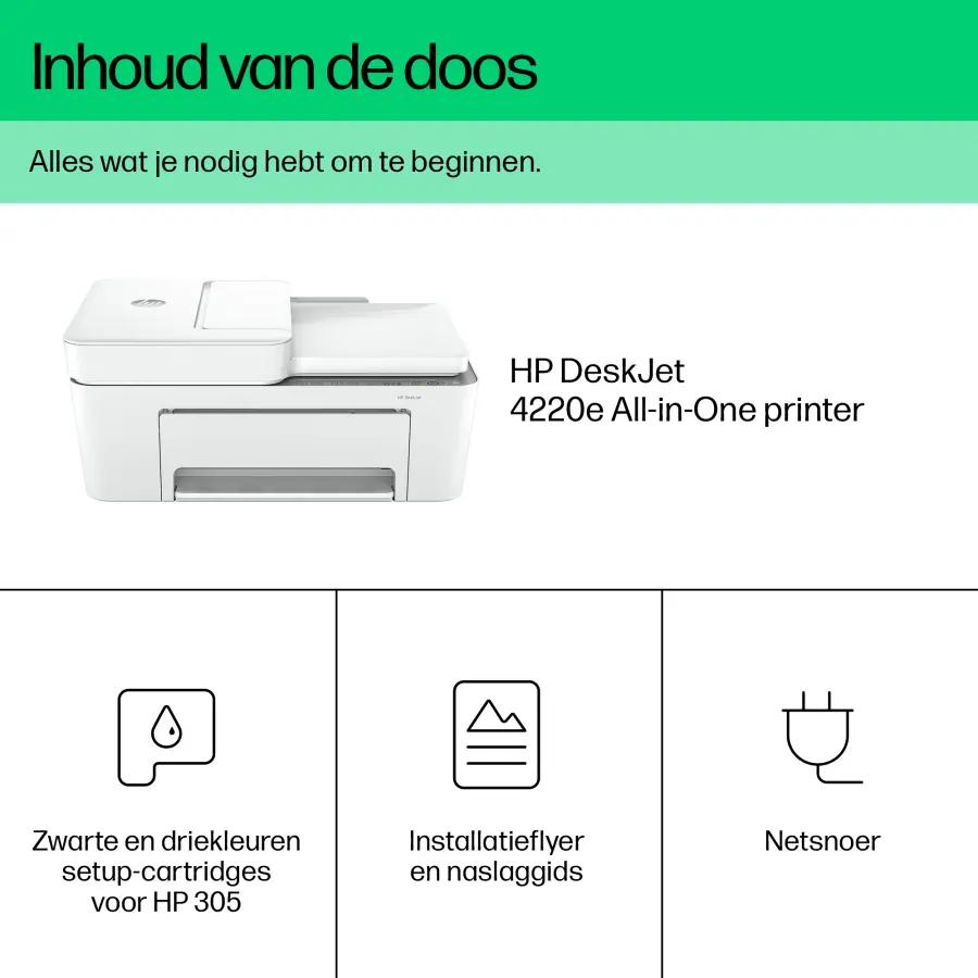 | Inhoud | HP DeskJet 4220e All-in-One Printer; HP 305 Setup Black Cartridge (~120 pages yield); HP 305 Setup Tri-Color Cartridge (~100 pages yield); Regulatory flyer; Setup guide; Reference guide; Power cord [For ink volume and page yield information, visit http:// |