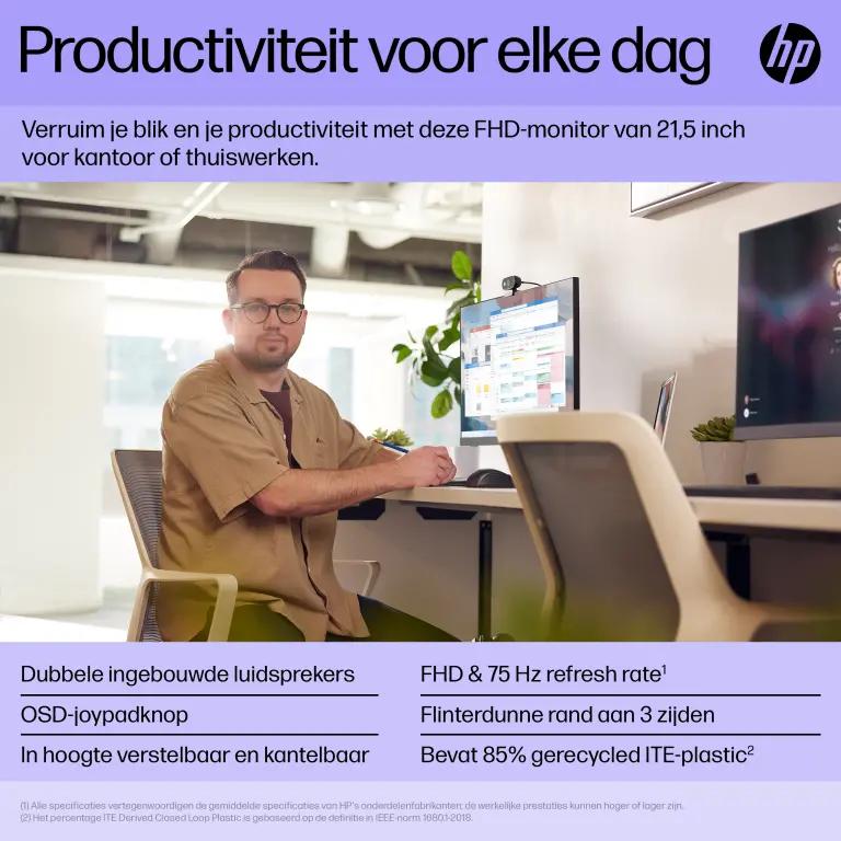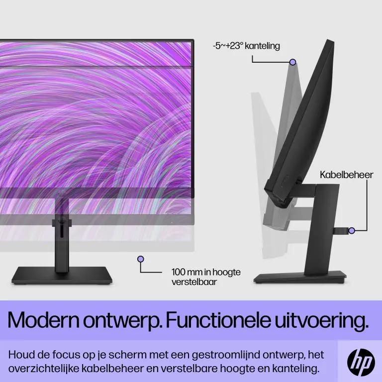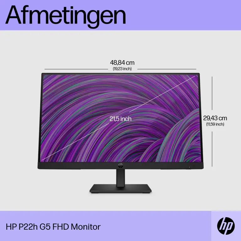De HP P22h G5 monitor biedt een beeldschermdiagonaal van 54,6 cm (21,5 inch) en een resolutie van 1920 x 1080 pixels. Dankzij het IPS-paneel geniet je van een helder, vloeiend beeld met een brede kijkhoek van 178° horizontaal en verticaal. Dit betekent dat je vanuit vrijwel elke positie een scherpe en consistente kleurweergave hebt, ideaal voor productief thuiswerken of op kantoor.