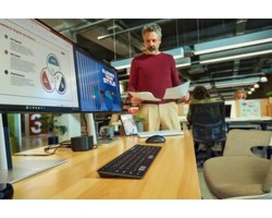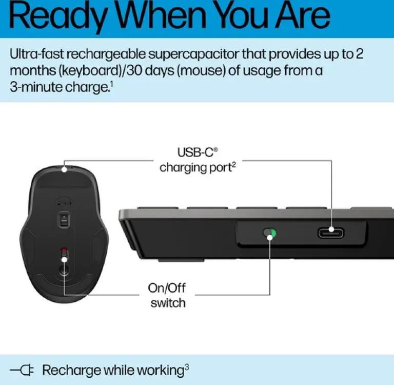 Met de HP 725 Multi oplaadbare draadloze toetsenbord en muis combo hoef je nooit meer batterijen te vervangen. Dankzij de ultrasnelle oplaadbare supercondensator gaat het toetsenbord tot wel 2 maanden mee en de muis tot 30 dagen na slechts 3 minuten opladen. Je kunt ook gewoon blijven werken terwijl je de apparaten via de USB-C-kabel oplaadt. Dit betekent minder onderbrekingen en meer focus op je werk.