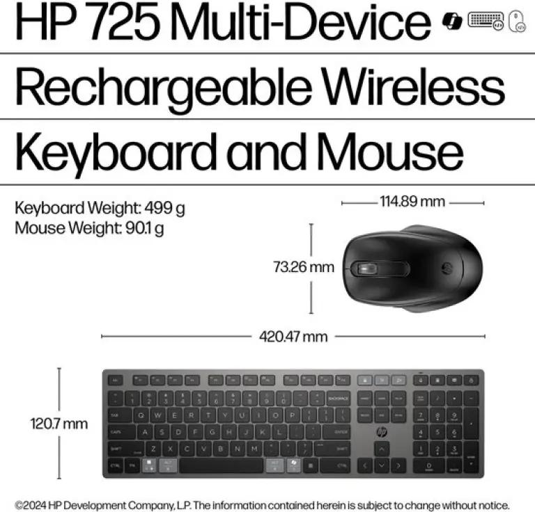 | Model | HP 725 Multi Rchrgbl WLS KB/MSE Belgium toetsenbord Inclusief muis Kantoor RF-draadloos + Bluetooth Zwart |