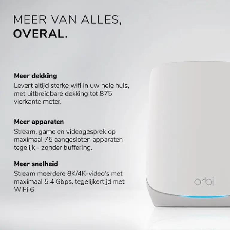 De Orbi RBK762S maakt gebruik van de nieuwste wifi 6-technologie met een tri-band netwerk. Dit betekent dat je kunt rekenen op ultrasnelle verbindingen tot 5400 Mbps, verdeeld over de 2.4 GHz en twee 5 GHz banden. Dankzij MU-MIMO en beamforming technologie kunnen wel 40 apparaten tegelijk verbonden zijn zonder snelheidsverlies. Ideaal voor drukke huishoudens of kantoren met veel slimme apparaten.