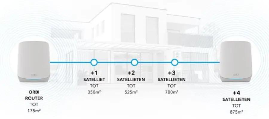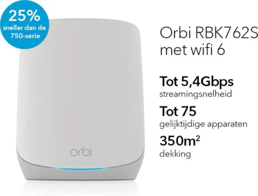 | Verpakkingsinhoud | "• One (1) Orbi Router (RBR760)• One (1) Orbi Satellite (RBS760)• One (1) 2m Ethernet cable• Two (2) power adapters• Quick start guide " |