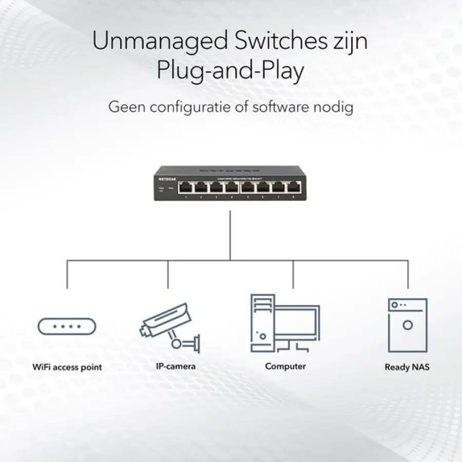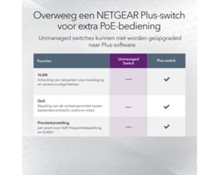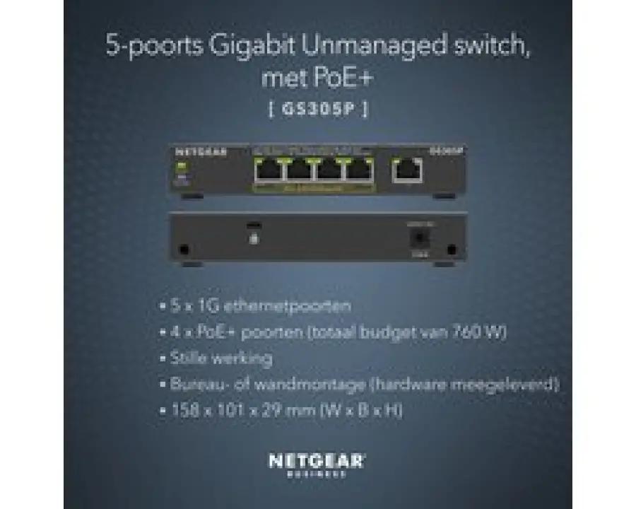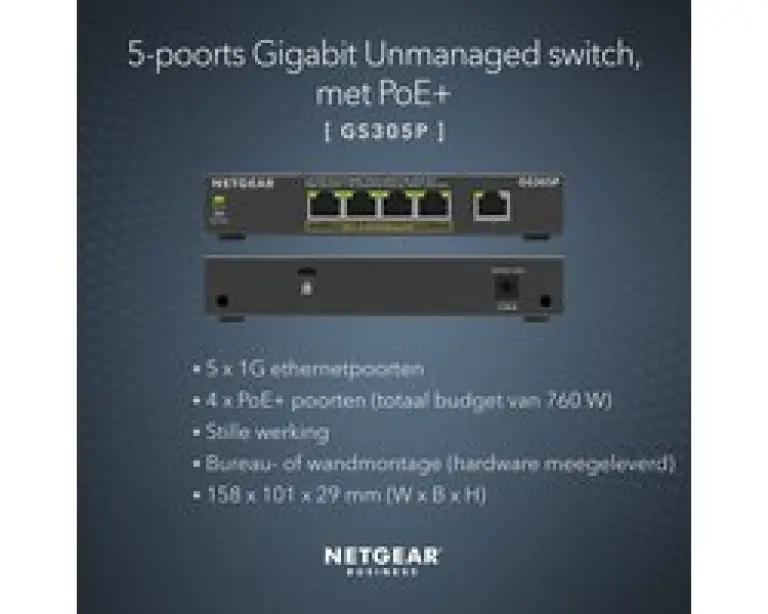 De NETGEAR GS305Pv3 is een unmanaged netwerkswitch die je netwerk eenvoudig uitbreidt met vijf Gigabit Ethernet-poorten. Dankzij de volledige duplex-ondersteuning geniet je van een snelle en stabiele verbinding tot 1 Gbps per poort. Het zwartgekleurde apparaat is compact en past makkelijk in elke werkomgeving.