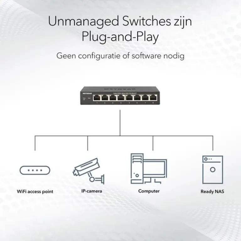 De GS305Pv3 werkt zonder configuratie, waardoor je hem direct uit de doos kunt gebruiken. Het apparaat is voorzien van een muurbeugel, zodat je de switch makkelijk aan de muur kunt monteren en zo ruimte bespaart op je bureau. Bovendien is de switch energiezuinig en stil, want er zit geen ventilator in.