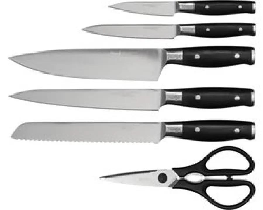 De set bevat een 20 cm keukenmes, een 20 cm vlees- en braadmes, een 20 cm broodmes (kartel), een 13 cm hobbymes, een 9 cm groentemes en een roestvrijstalen keukenschaar. Elk mes heeft zijn eigen specialiteit, van fijn snijden en fileren tot het snijden van brood en groenten. De keukenschaar is perfect voor het knippen van kruiden en andere keukentaken.