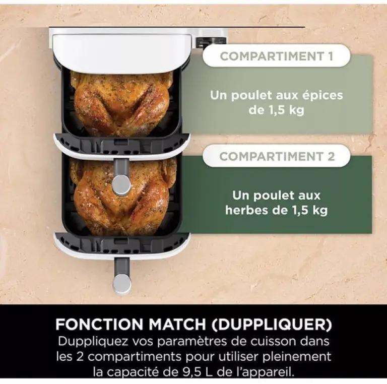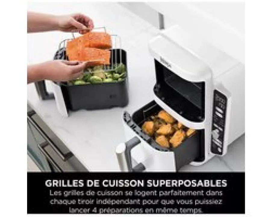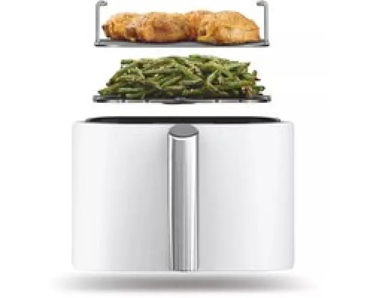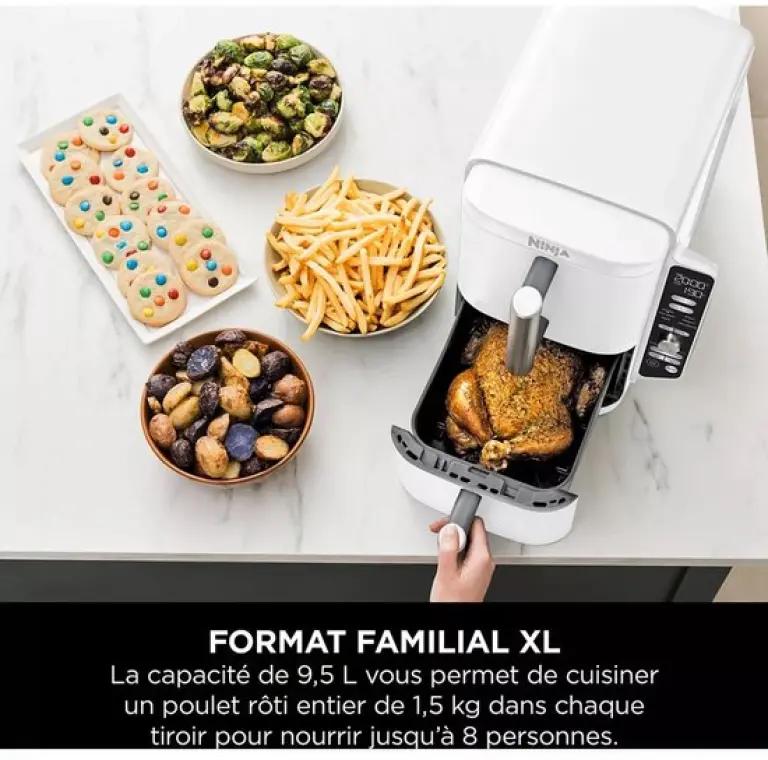 De Ninja SL400EUWH is een innovatieve dubbele heteluchtfriteuse die perfect is voor gezinnen en mensen met beperkte aanrechtruimte. Met een totaal van 9,5 liter verdeeld over twee aparte lades van elk 4,75 liter, kun je makkelijk grote porties bereiden. Elke lade kan zelfs een hele kip van 1,4 kg bevatten, ideaal voor maximaal 8 personen. Ondanks zijn royale capaciteit neemt hij dankzij het verticale ontwerp minder ruimte in op je aanrecht en past hij onder de keukenkastjes.