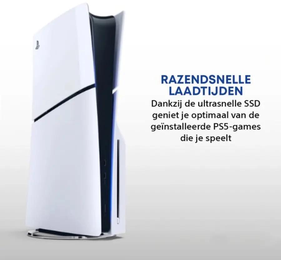 De PS5 Slim heeft een compact en strak design dat makkelijk in je woonkamer past zonder te veel ruimte in te nemen. Dit slanke model combineert krachtige technologie met een modern uiterlijk, zodat je gamestijl ook visueel indruk maakt.