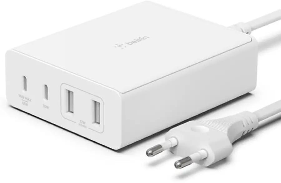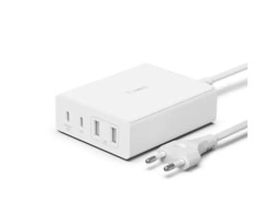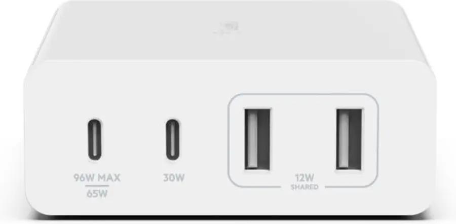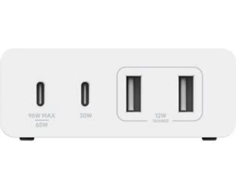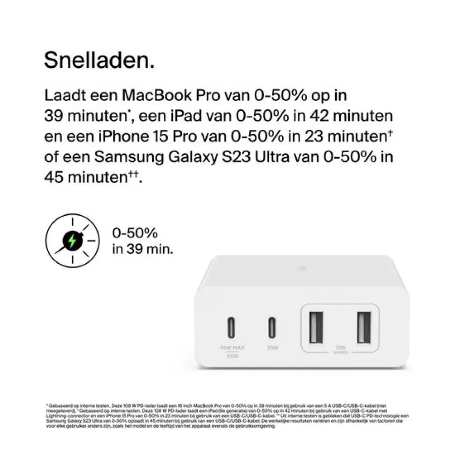 Met de Belkin WCH010VFWH 4-poorts GaN lader laad je eenvoudig al je mobiele apparatuur op. Deze krachtige lader levert een totaal vermogen van 108 watt via vier poorten: twee USB-C en twee USB-A. De nieuwste Gallium Nitride (GaN) technologie zorgt ervoor dat de lader compact, licht en efficiënt is, waardoor hij minder warmte genereert dan traditionele laders.