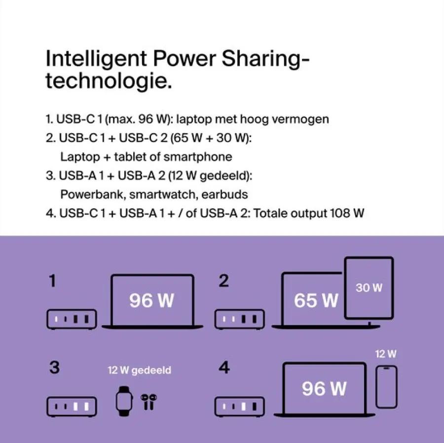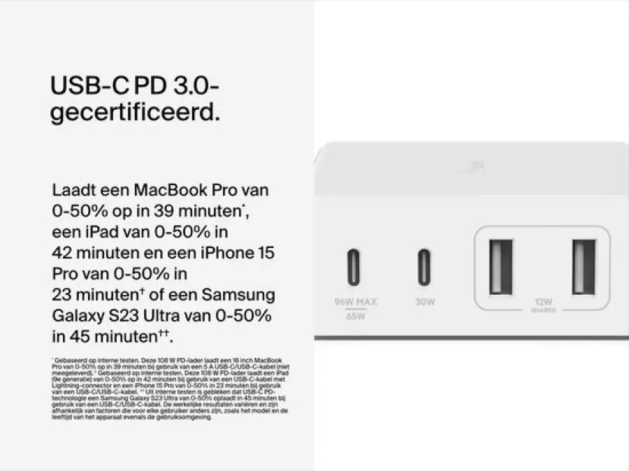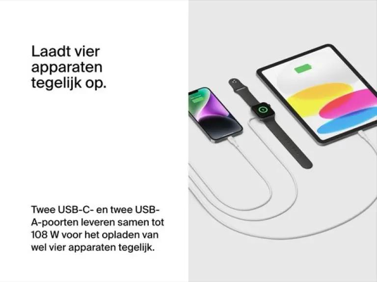 Deze Belkin lader is geschikt voor een breed scala aan apparaten, waaronder Apple-producten zoals MacBook Pro en iPhone, maar ook Samsung Galaxy, Google Pixel, Microsoft Surface en andere USB-C en USB-A apparaten. Het is de ideale lader voor wie meerdere apparaten tegelijk wil opladen zonder gedoe met meerdere laders en kabels.