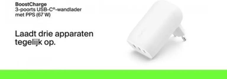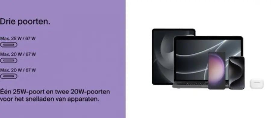 Deze oplader beschikt over 3 USB-Type-C-poorten, zodat je meerdere apparaten tegelijk kunt opladen. Ideaal voor thuis of op kantoor, waar je al je gadgets in één keer kunt voorzien van stroom zonder gedoe met meerdere laders.