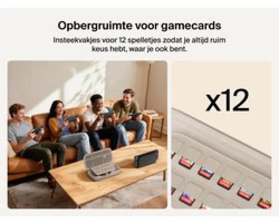 Naast de console biedt deze hoes ruimte voor maximaal 12 gamecards, netjes georganiseerd en beschermd. Ook is er een verborgen vak speciaal voor een AirTag, zodat je jouw Switch hoes altijd kunt terugvinden. Zo hoef je nooit meer te zoeken naar je kostbare apparaat.