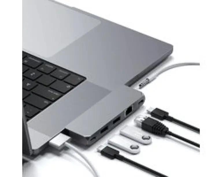 De Satechi Pro Hub Mini is ontworpen om de mogelijkheden van jouw M1 MacBook Pro uit te breiden met een reeks handige aansluitingen. Deze compacte hub biedt een volledig functionele USB4-poort die tot 96 W kan opladen, een indrukwekkende 6K 60 Hz beeldschermuitvoer ondersteunt en een supersnelle gegevensoverdracht tot 40 Gbps mogelijk maakt. Daarnaast beschikt de hub over twee USB-A 3.0 data aansluitingen, een USB-C gegevenspoort, een Gigabit Ethernet aansluiting voor stabiele netwerkverbindingen en een audio-jack aansluiting voor je koptelefoon of speakers.