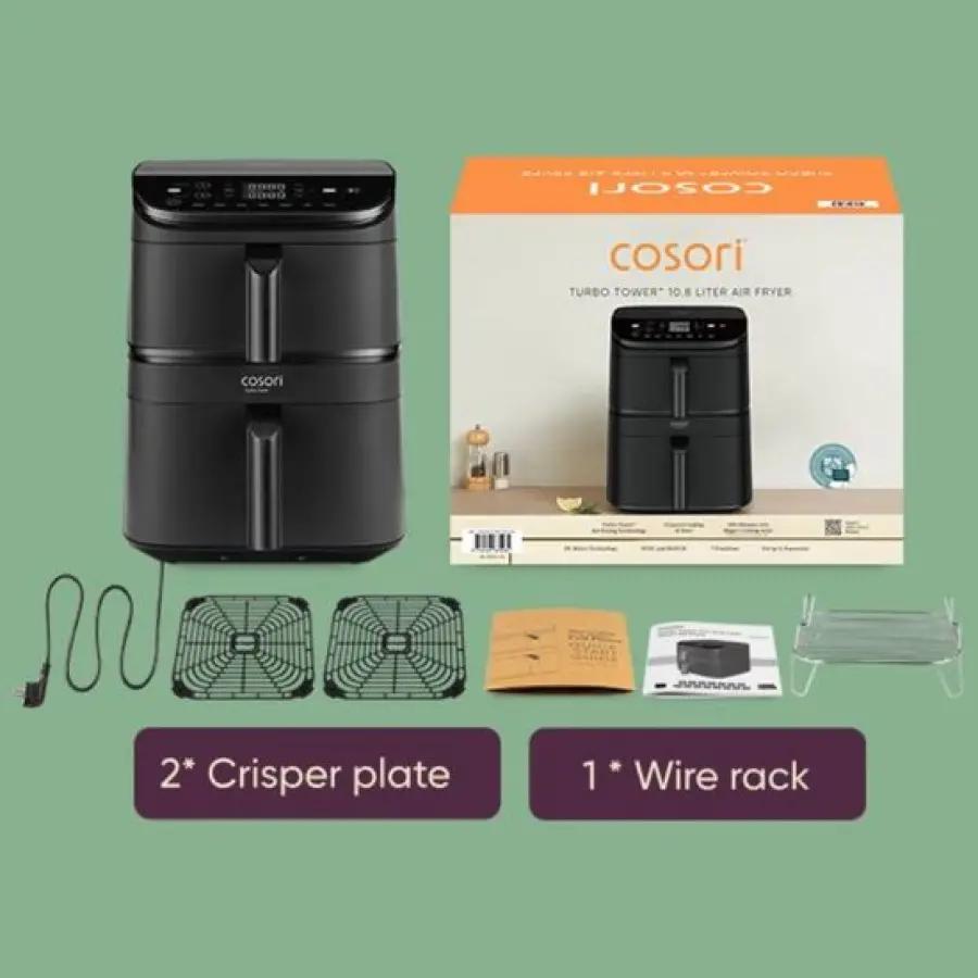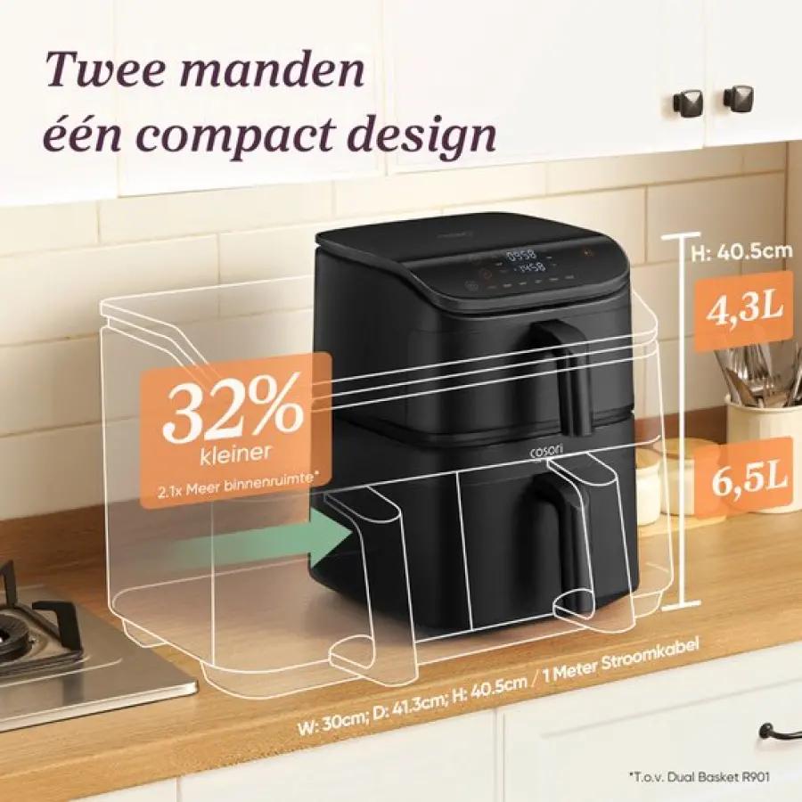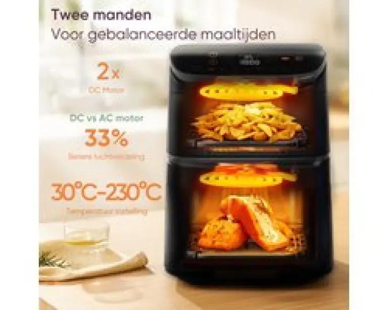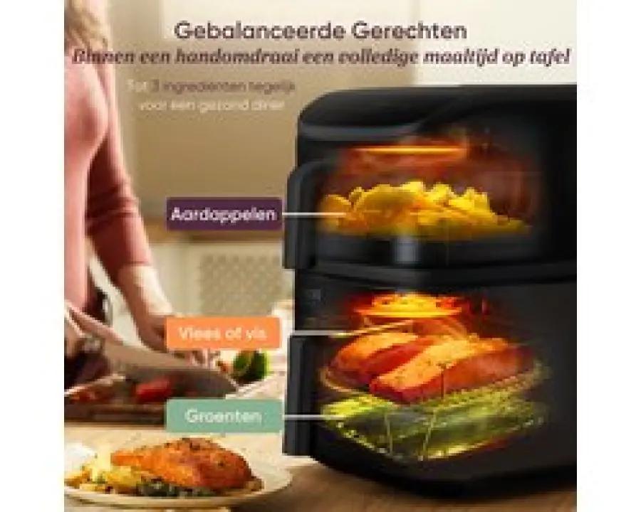 Ben jij op zoek naar een ruime airfryer die geschikt is voor het hele gezin? De Cosori Turbo Tower met een totale inhoud van 10,8 liter is precies wat je nodig hebt. Dankzij het slimme verticale ontwerp met twee aparte manden (4,3 liter boven en 6,5 liter onder) kun je verschillende gerechten tegelijkertijd bereiden zonder dat smaken mengen. Perfect voor een snelle en gezonde maaltijd, zonder gedoe.