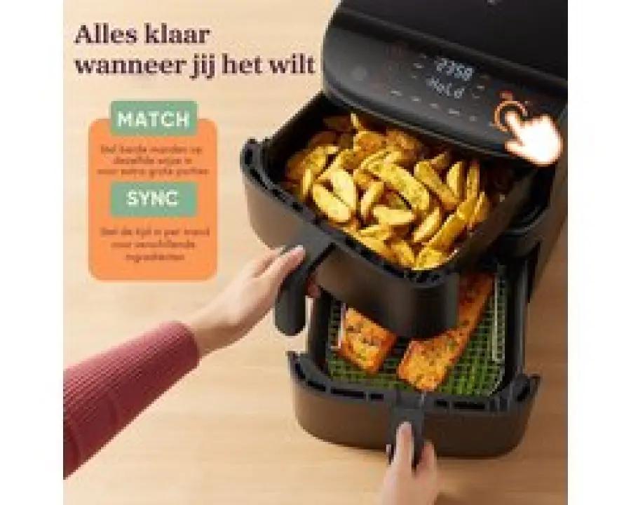 Met de innovatieve Sync&Match functie bedien je beide manden via één touchscreen. Je kunt ze synchroon hetzelfde programma laten draaien voor grotere porties, of juist apart instellen om verschillende gerechten tegelijk te bereiden. Zo bak je frietjes in de ene mand en gril je vis in de andere, zonder smaakvermenging.