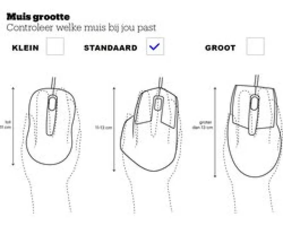 In principe zijn alle muizen te bedienen hoe groot/klein je handen ook zijn, toch is het voor een ergonomische houding belangrijk dat de muis past bij de handgrootte. Meet vanaf de pols tot het topje van de middelvinger en bepaal welk formaat het beste bij je past: