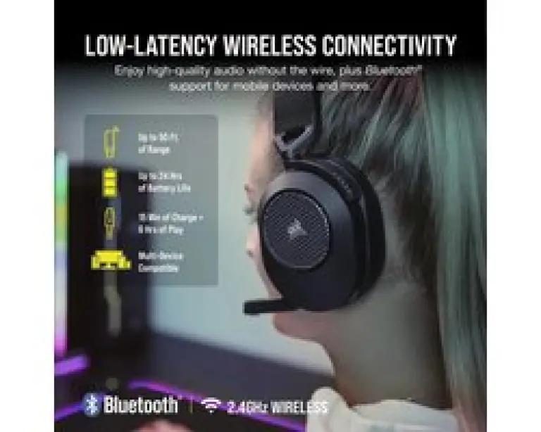 De Corsair HS65 Wireless headset biedt je de ultieme draadloze game-ervaring dankzij de 2,4 GHz verbinding met lage latentie en Bluetooth 5.2 ondersteuning. Zo geniet je van een stabiele verbinding tot wel 15 meter en een batterijduur van maximaal 24 uur. De omnidirectionele microfoon met flip-to-mute-functie zorgt ervoor dat jouw stem altijd duidelijk en zonder storingen overkomt tijdens het gamen of bellen.
