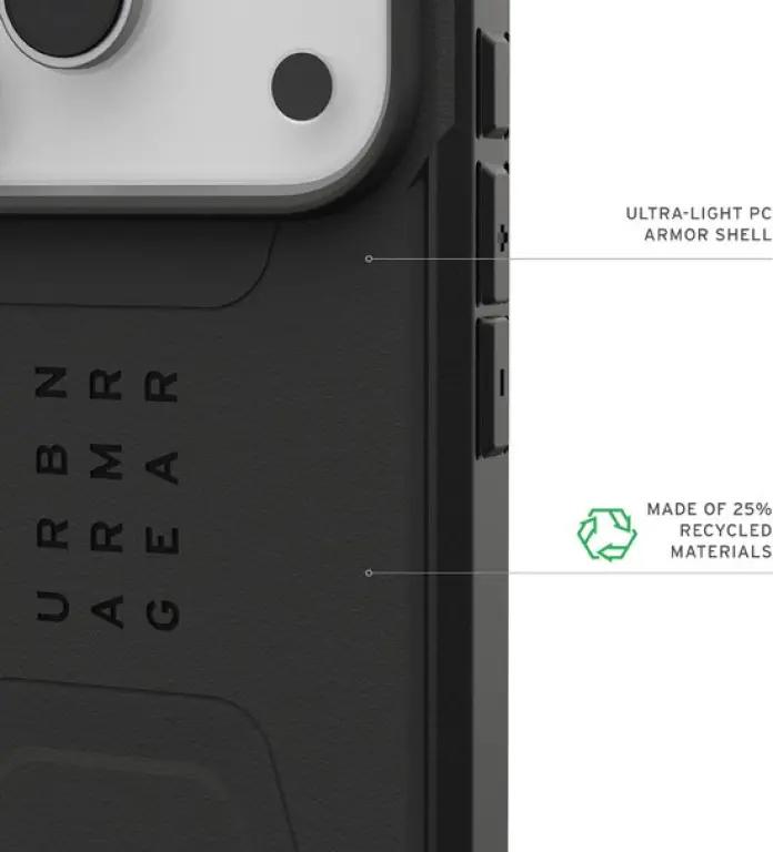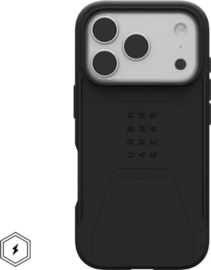 Geef jouw iPhone 17 Pro een robuuste en verzorgde look met de URBAN ARMOR GEAR Civilian Backcover. Deze stevige hoes combineert hoogwaardig kunststof met schokabsorberend siliconen materiaal, waardoor jouw smartphone optimaal beschermd wordt tegen de dagelijkse gevaren. Het dynamische zeshoekige patroon dempt schokken effectief en de hoes voldoet aan de militaire MIL-STD-810G valtestnormen, wat betekent dat je telefoon een val van wel 5 meter kan overleven zonder schade.