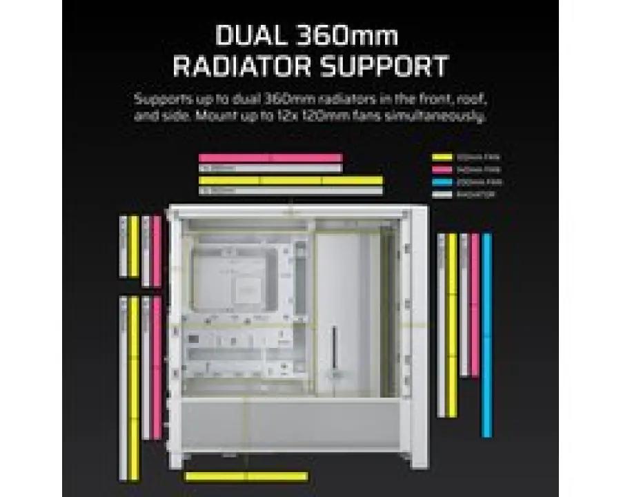 Het speciale Airflow-voorpaneel met 3D-Y-patroon zorgt voor een perfecte luchtstroom, zodat koele lucht precies daar komt waar je het nodig hebt. De behuizing ondersteunt dubbele 360 mm radiatoren, wat ideaal is voor geavanceerde waterkoeling. Hierdoor blijft je systeem koel, zelfs tijdens intensief gebruik.