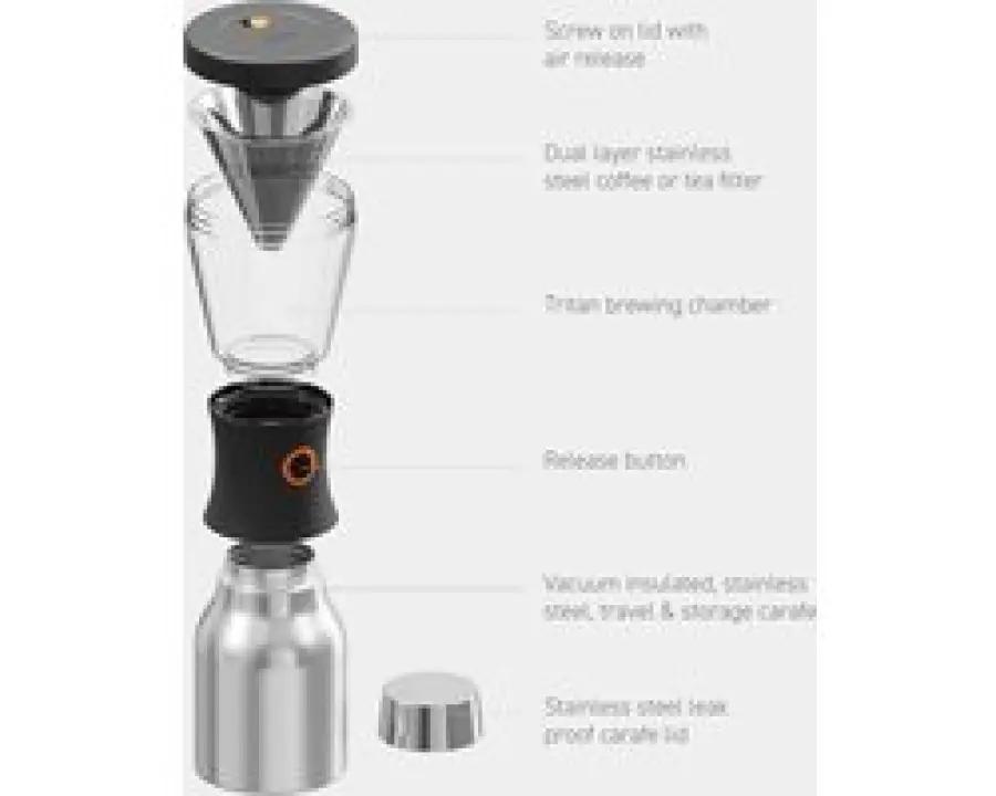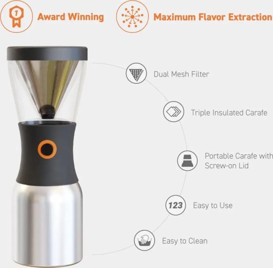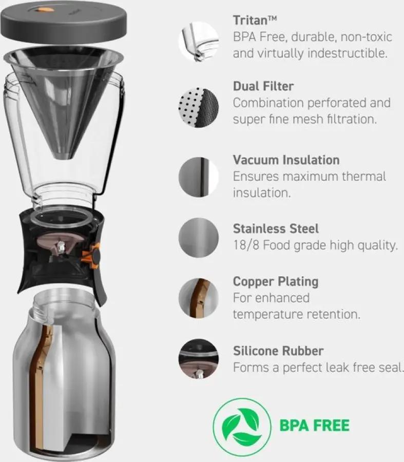 Het koffiezetapparaat is gemaakt van hoogwaardig roestvrijstaal gecombineerd met BPA-vrij kunststof. Dit zorgt niet alleen voor een lange levensduur, maar ook voor een veilige en milieuvriendelijke koffiebereiding. Het roestvrijstalen binnenwerk zorgt er bovendien voor dat je koffie lang koud blijft, ideaal voor warme dagen.