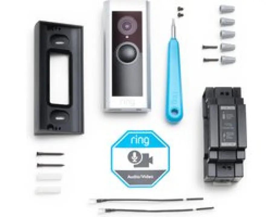 | Verpakkingsinhoud | Ring Video Doorbell Pro 2 Voorpaneel in nikkel-satijn DIN-rail-transformator van Ring (2de generatie) Installatiehulpmiddelen en schroeven Hoekmontageset Beknopte handleiding Beveiligingssticker |