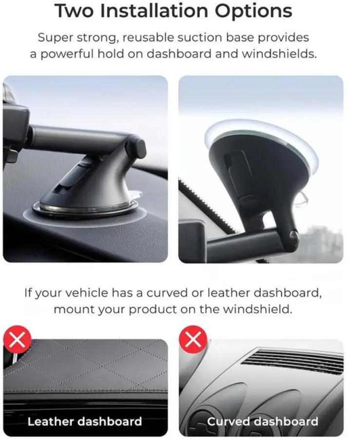 De sterke zuignap zorgt ervoor dat de houder stevig blijft zitten, zowel op het raam als op het dashboard van je auto. Zelfs tijdens hobbelige ritten blijft je telefoon stabiel op zijn plek. Zo hoef jij je geen zorgen te maken over vallen of schuiven.