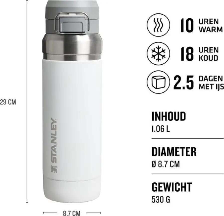 De Stanley Quick Flip waterfles met een inhoud van 1.06 liter (32 oz) is jouw ideale metgezel voor onderweg. Dankzij de hoogwaardige dubbelwandige vacuümisolatie blijft je drankje koud tot wel 30 uur en warm tot 5 uur, ongeacht het weer buiten. Of je nu een wandeling maakt, op kantoor zit of een dagje uit bent, je geniet altijd van de perfecte temperatuur. Het drukknopdeksel maakt drinken makkelijk en snel, zodat je geen moment hoeft te missen.