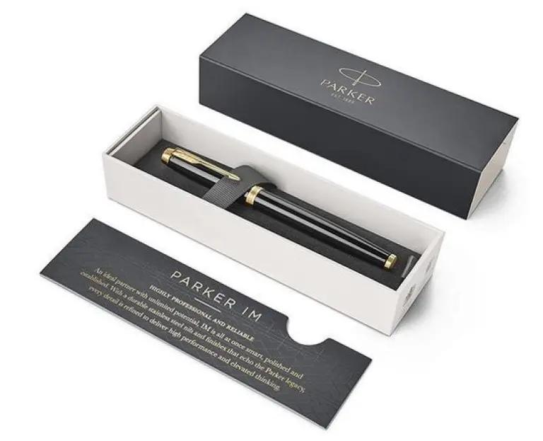 De Parker IM-rollerbalpen combineert een strak, glanzend ontwerp met professionele uitstraling. De slanke, taps toelopende vorm sluit perfect aan bij een moderne schrijfstijl en maakt indruk bij elke handeling. De diepe zwarte lak wordt prachtig afgelijnd met een opvallende gouden afwerking, waardoor deze pen niet alleen een schrijfinstrument is, maar ook een stijlvol accessoire.