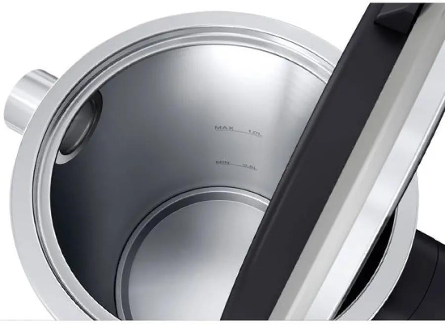 Met een inhoud van 1 liter is deze waterkoker ideaal voor kleinere hoeveelheden water. Het deksel opent geruisloos met één druk op de knop, waardoor je snel en makkelijk water kunt bijvullen. De grote opening maakt schoonmaken eenvoudig. Dankzij het snoerloze ontwerp en de 360 graden draaibare kan plaats je de waterkoker altijd in de gewenste positie.