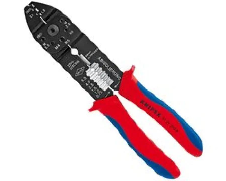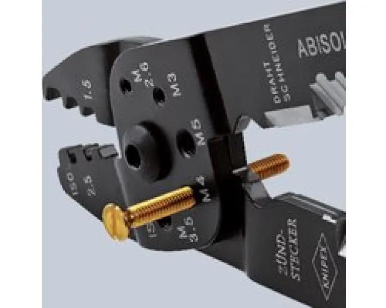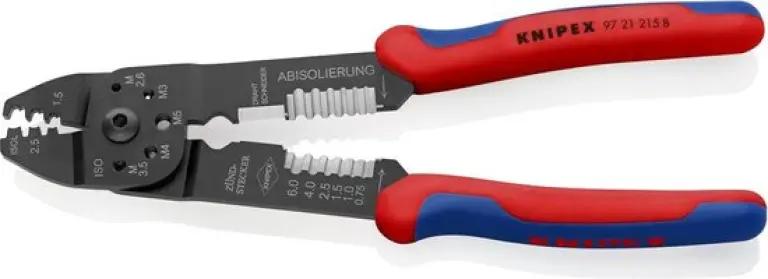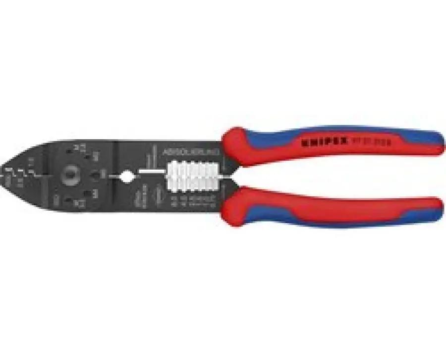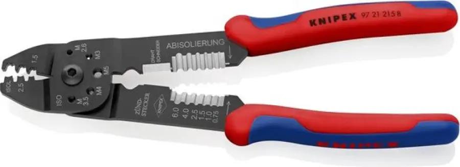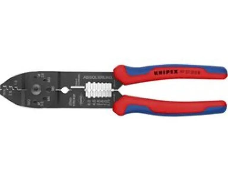 De KNIPEX 97 21 215 B krimptang is ideaal voor het knippen van kabels, het afstrippen van draden en het krimpen van zowel geïsoleerde als niet-geïsoleerde kabelschoenen en aansluitstekkers. Dankzij de schroefdraadgaten kun je ook Cu- of Ms-schroefdraadpennen knippen met afmetingen van M 2,6 tot 5,0 mm. Dit maakt de tang een veelzijdig hulpmiddel voor diverse elektrische werkzaamheden.