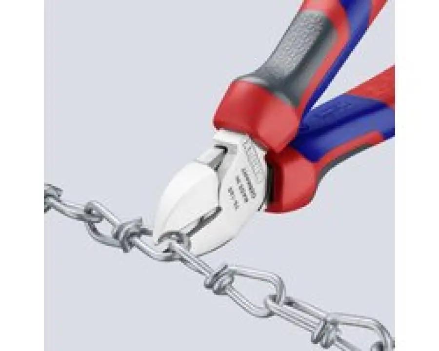 De benen van de tang zijn voorzien van een stevige, rood/blauwe 2-componenten isolatie die niet alleen voor een comfortabele grip zorgt, maar ook beschermnokken bevat voor extra veiligheid tijdens het gebruik. Dit maakt de tang geschikt voor zowel harde als zachte draad, waarbij de precisie snijkanten extra inductief gehard zijn met een hardheid van ongeveer 62 HRc voor nauwkeurig en krachtig knippen.