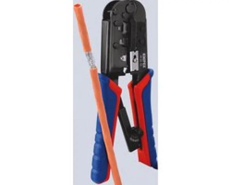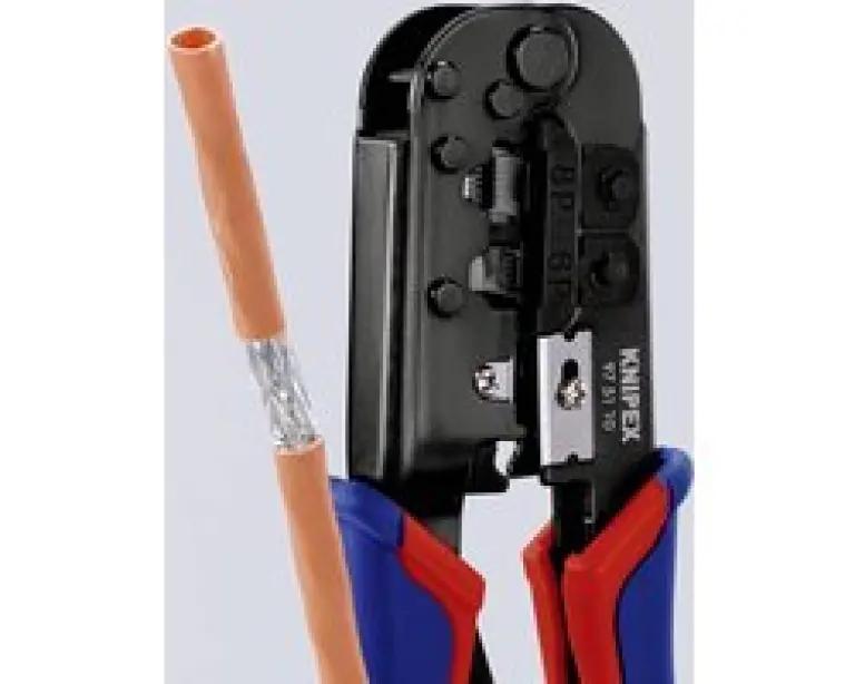 De KNIPEX 97 51 10 krimptang is speciaal ontworpen voor het krimpen van 6- en 8-polige westernstekkers van het type RJ 11/12 en RJ 45. Met een lengte van 190 mm ligt deze tang prettig in de hand en biedt hij optimale controle tijdens het werk. Dankzij de lange vorm en nauwkeurige parallelkrimp zorg je voor een perfecte verbinding zonder beschadigingen.