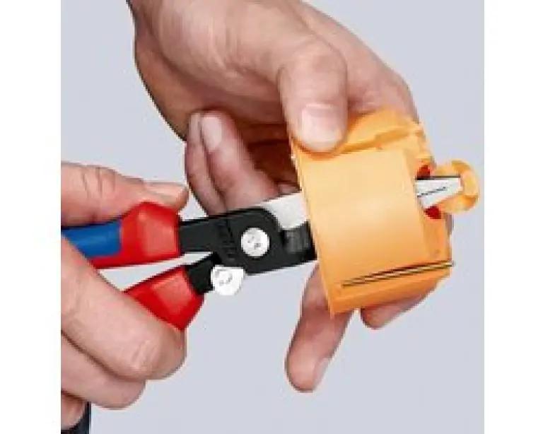 Dankzij de gladde grijpvlakken aan de punt pak je draden zonder ze te beschadigen. De geprofileerde grijpvlakken en het brandergat zorgen voor een stevige grip op vlak en rond materiaal. Met de markante buitenrand langs de grijpvlakken werk je moeiteloos aan inbouwdozen en ontbraam je doorvoergaten.