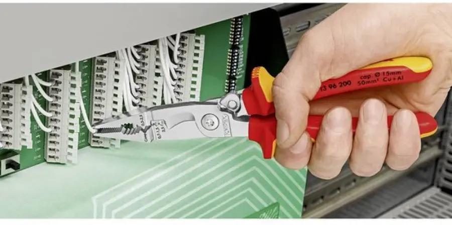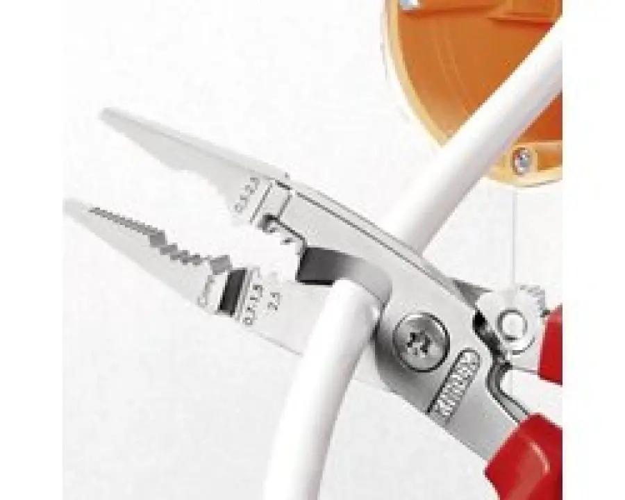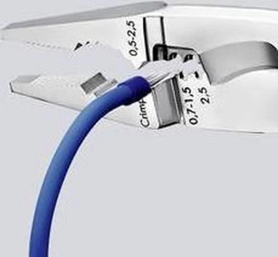 De tang heeft handige afstrip-uitsparingen voor kabels van 0,75 tot 1,5 mm² en 2,5 mm² en een krimppositie voor adereindhulzen van 0,5 tot 2,5 mm². De kabelschaar met precisie-snijkanten (inductief gehard) knipt moeiteloos koper- en aluminiumkabels tot 5 x 2,5 mm² of een diameter van 15 mm. De slanke constructie maakt het mogelijk om ook op moeilijk bereikbare plekken te werken.