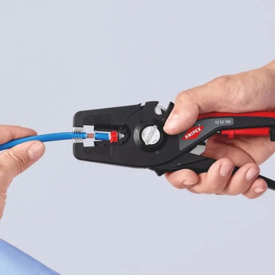 De tang heeft een ergonomische tweecomponentenhandgreep die comfortabel in de hand ligt. De halfronde metalen bek met kamprofiel biedt een goede grip, wat het strippen en snijden vergemakkelijkt. Bovendien is er een instelbare lengteaanslag aanwezig voor herhaalde, nauwkeurige werkzaamheden.
